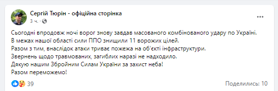 По его словам, ночью в Хмельницкой области было уничтожено 11 вражеских целей.