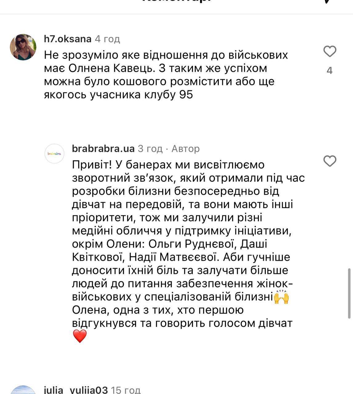 "Ваша реклама с Кравец - это дно дна: "говорит за военную "Пиранька"... а "Пиранька" недостойна быть на фото?"; "Непонятно, какое отношение к военным имеет Елена Кравец. С таким же успехом можно было Кошевого разместить или еще какого-нибудь участника клуба-95", - поддержали Малу пользователи.