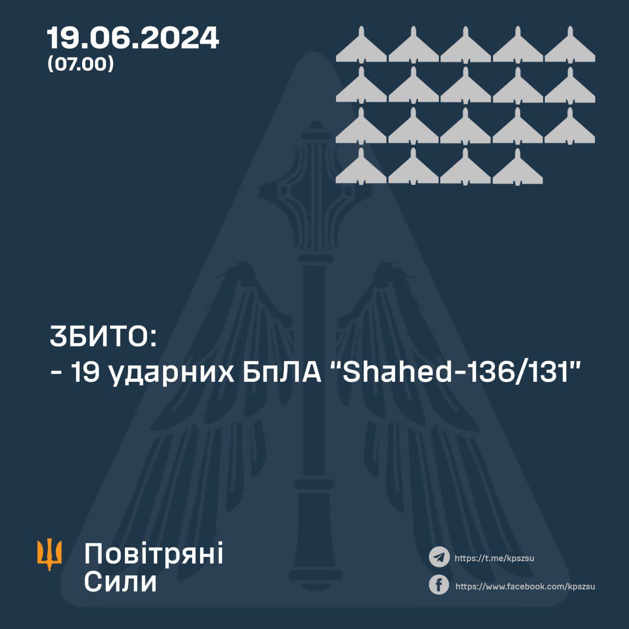Ночью 19 июня был налёт из 21 беспилотника "Шахед" по Украине. Удалось сбить 19 дронов.