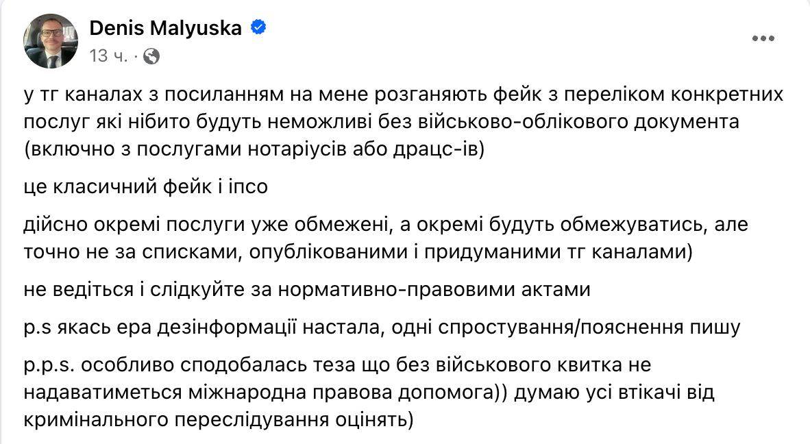 "Действительно, отдельные услуги уже ограничены, а отдельные будут ограничиваться, но точно не по спискам, опубликованным и придуманным телеграм-каналами. Особенно понравился тезис, что без военного билета не будет предоставляться международная правовая помощь. Думаю, все беглецы от уголовного преследования оценят", - пишет Малюська.
