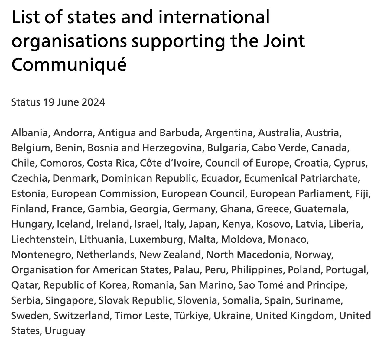 Вскоре после публикации Зеленского правительство Швейцарии сообщило, что к мирной декларации присоединилась Организация американских государств, увеличив количество поддержавших коммюнике до 84 государств и организаций.