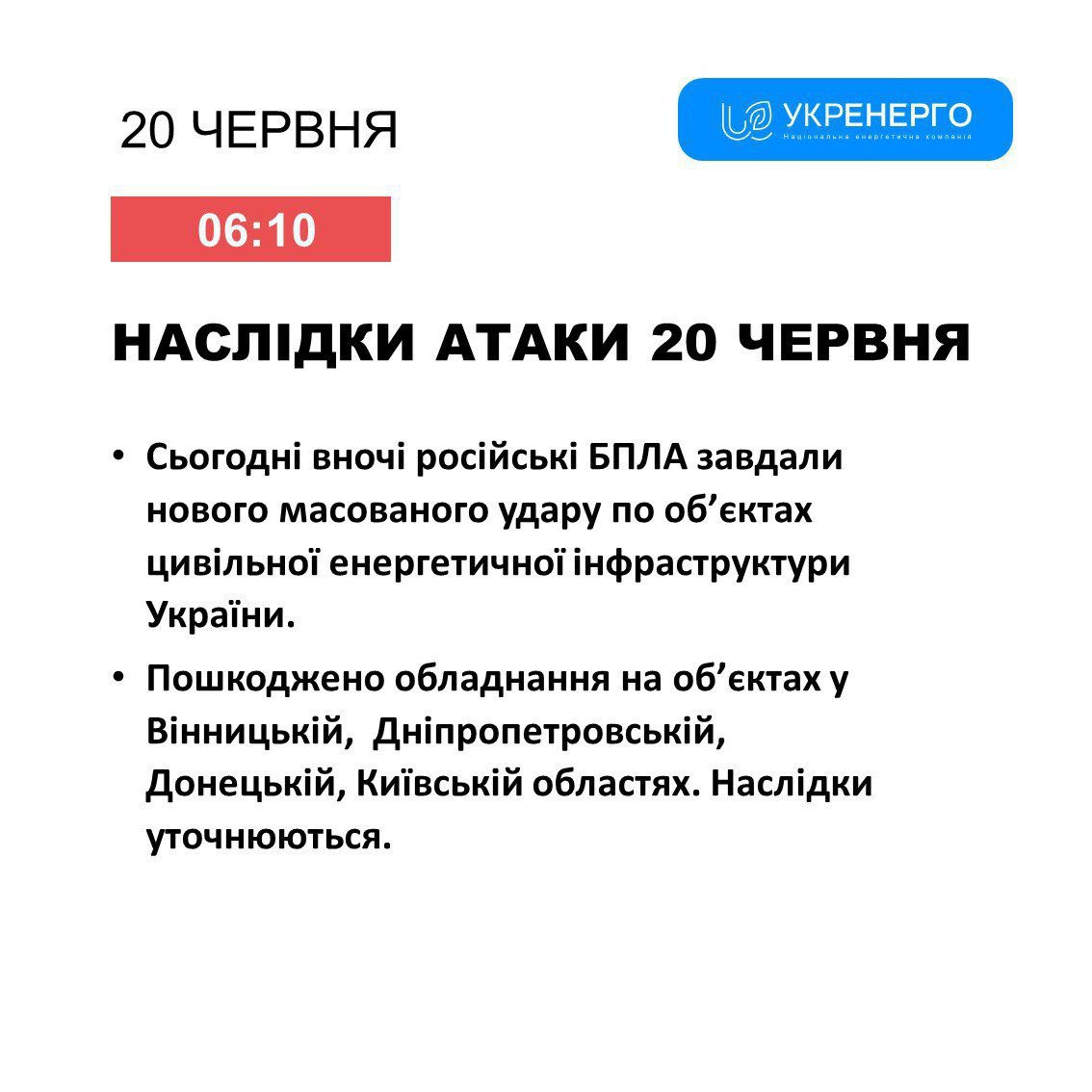 В "Укрэнерго" сообщили, что сегодня ночью российские дроны атаковали объекты энергетики в Киевской, Винницкой, Днепропетровской и Донецкой областях.