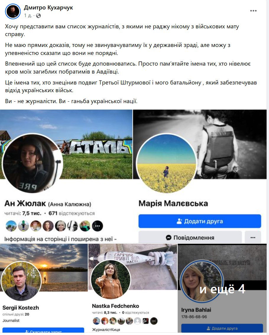В ответ Кухарчук опубликовал список "непорядочных журналистов", куда вошли Калюжная и еще несколько имен.