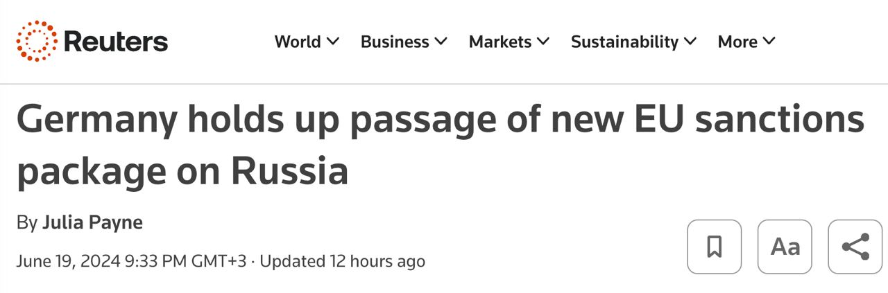 Однако в среду Германию снова заблокировала принятие нового пакета санкций, который обсуждают уже больше месяца. По какой причине, Reuters не уточняет.