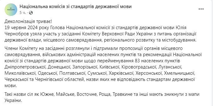 "Такие названия деревень, как Южное, Майское, Восточное, Роща, Травкино и другие должны исчезнуть с карты Украины", - указывает пресс-служба Нацкомиссии.