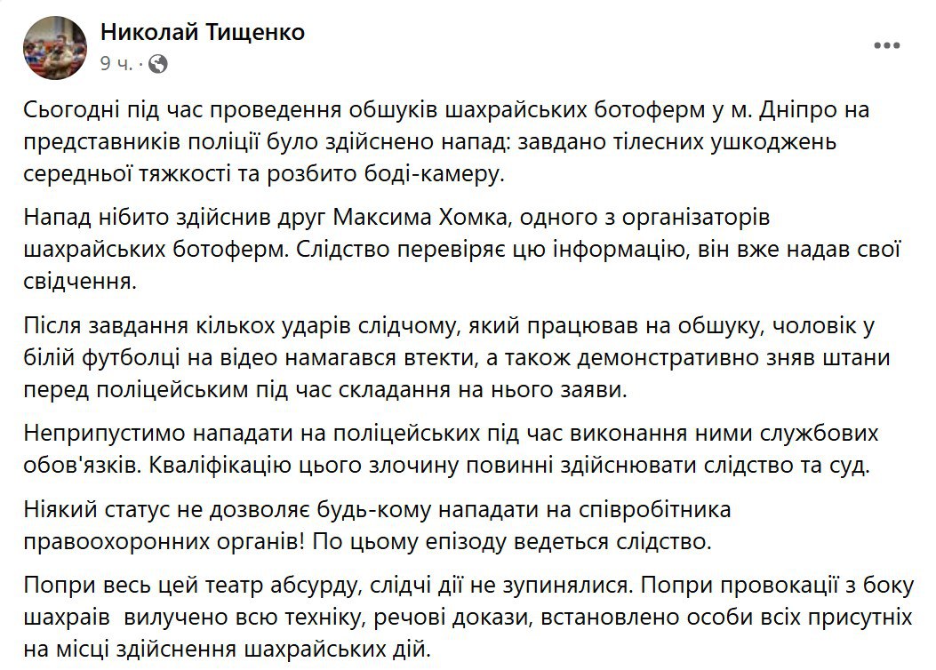 Тищенко вчера сообщал, что приехал в Днепр для борьбы с мошенническими колл-центрами. После появления видео с избиением Павлова, нардеп заявил, что этот мужчина "срывал следственные действия" в одном из колл-центров по заказу их владельцев. Тищенко утверждает, что Павлов работает начальником охраны в колл-центре.