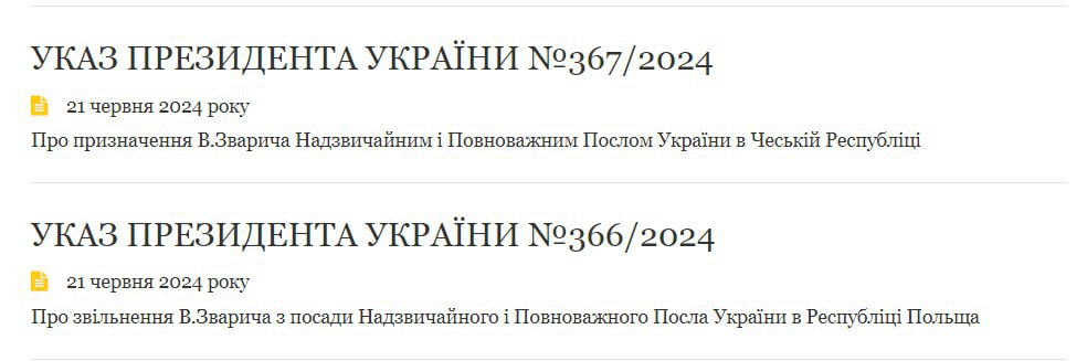 Зеленский уволил Зварича с должности посла в Польше и назначил его послом в Чехию