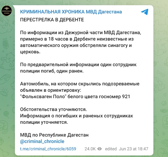"По информации из дежурной части МВД Дагестана, примерно в 18 часов в Дербенте неизвестные из автоматического оружия обстреляли синагогу и церковь. По предварительной информации, один сотрудник полиции погиб, один ранен", - говорится в сообщении.