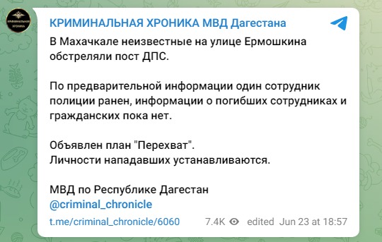 Позже в МВД Дагестана рассказали, что в Махачкале неизвестные обстреляли пост ДПС на улице Ермошкина, в результате чего один полицейский получил ранение.