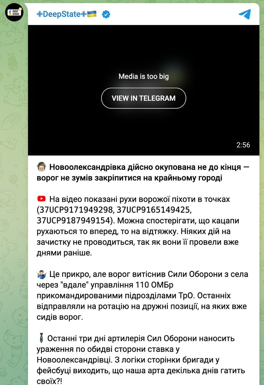 При этом в 110-й бригаде ВСУ сегодня опровергли информацию Deep State о потере Новоалександровки.