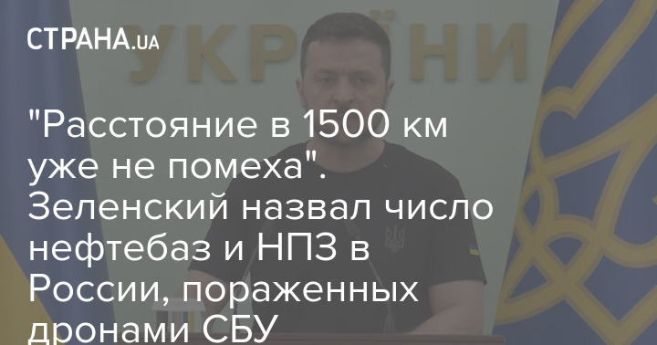 "Расстояние в 1500 км уже не помеха". Зеленский назвал число нефтебаз и НПЗ в России, пораженных дронами СБУ