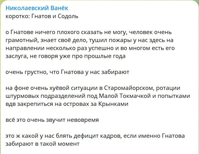 "Очень грустно, что Гнатова у нас забирают. На фоне очень х@вой ситуации в Старомайорском, ротации штурмовых подразделений под Малой Токмачкой и попытками ВДВ закрепиться на островах за Крынками всё это очень звучит невовремя. Это же какой у нас, бл@ть, дефицит кадров, если именно Гнатова забирают в такой момент", – пишет "Ванек".