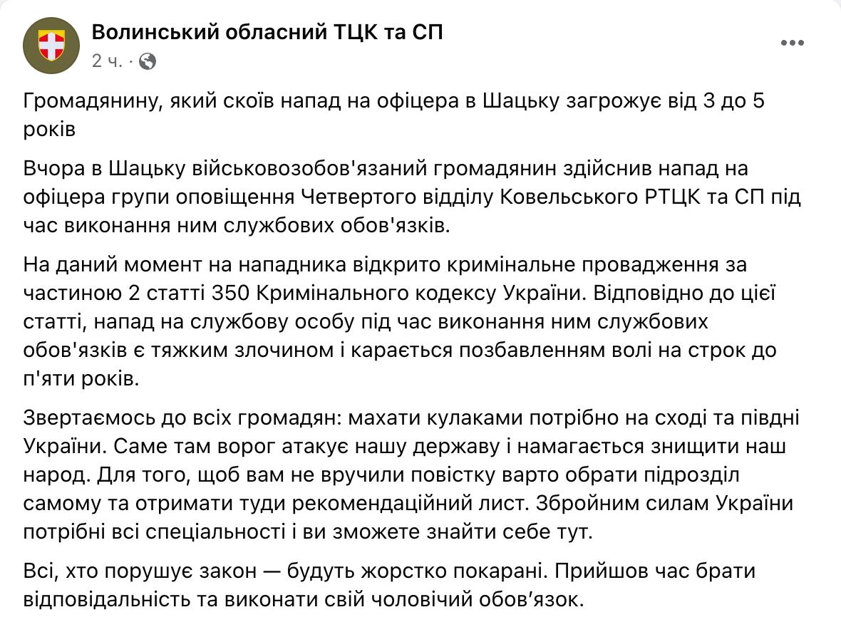 13.49 В Волынской области мужчина напал на офицера ТЦК, сообщает военкомат.