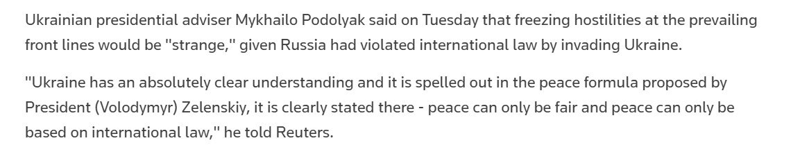 По словам советника главы ОП Подоляка, заморозить войну на нынешних линиях фронта было бы "странно", поскольку РФ незаконно находится на украинской территории.