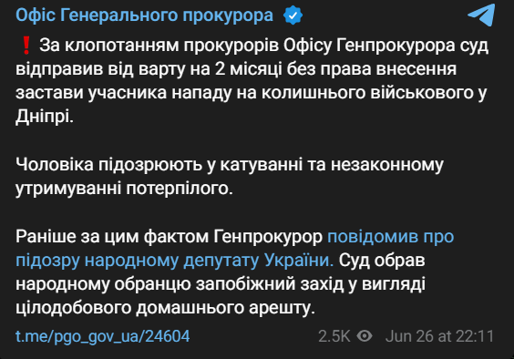 Об этом сообщает Офис генерального прокурора.