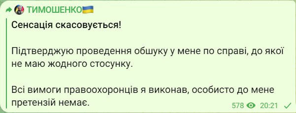 "Сенсация отменяется! Подтверждаю проведение обыска у меня по делу, к которому не имею никакого отношения. Все требования правоохранителей я выполнил, лично ко мне претензий нет", – сказано в публикации Тимошенко.