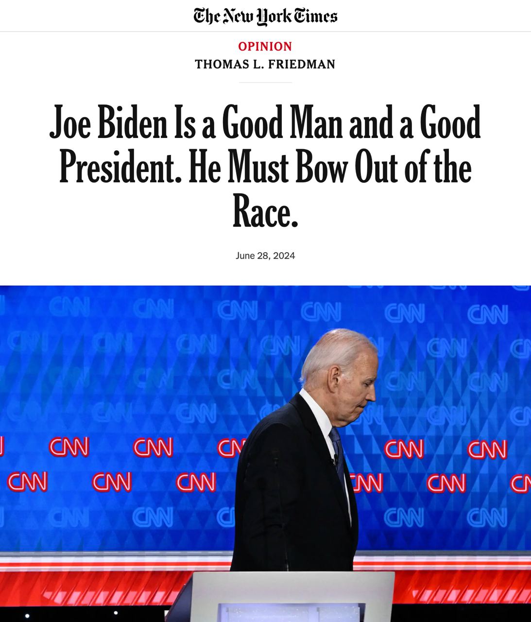 "Джо Байден - хороший человек и хороший президент. Он должен выйти из гонки", - пишет Фридман.