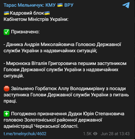 Также Мельничук сообщил, что Горбатюк Алла Владимировна уволена с должности заместителя главы Государственной службы Украины по вопросам труда.