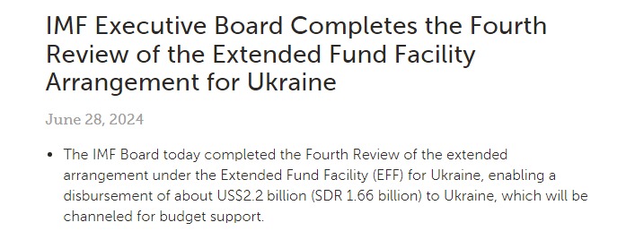 "Совет МВФ сегодня завершил четвертый пересмотр расширенного соглашения в рамках механизма расширенного финансирования (EFF) для Украины, что позволило выделить Украине около 2,2 миллиарда долларов США, которые будут направлены на поддержку бюджета. В результате общий объем выплат по программе, поддерживаемой МВФ, составит около $7,6 млрд", - сказано в пресс-релизе.