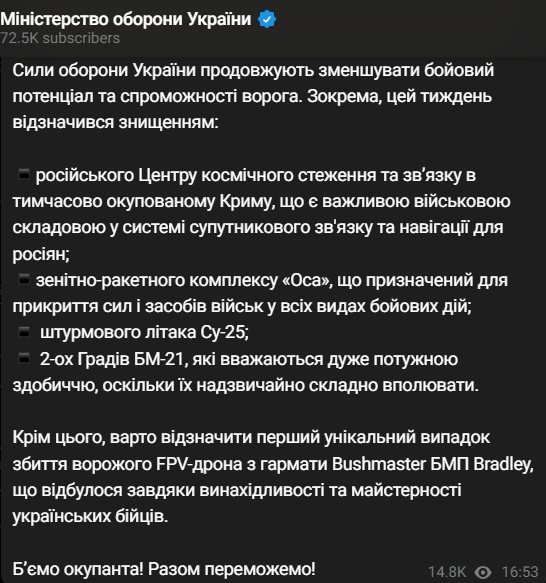 Помимо этого, ВСУ успешно поразили штурмовик "Су-25", ЗРК "Оса" и две РСЗО "Град" армии РФ. Вся эта техника была уничтожена.