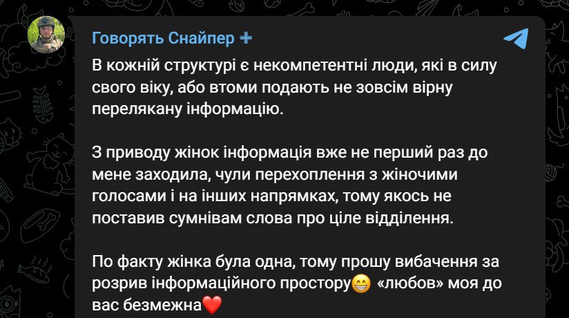"По факту женщина была одна, поэтому прошу прощения за разрыв информационного пространства", - заявил военный и сослался на "некомпетентных людей", приславших ему эту информацию.