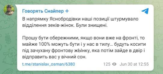 "Прошу быть осторожными, если они уже на фронте, то почти 100% могут быть и в тылу… Будут косить под фронтовую женщину, которая войдет ночью во двор и отправит вас в вечный сон", - предупреждает военный.