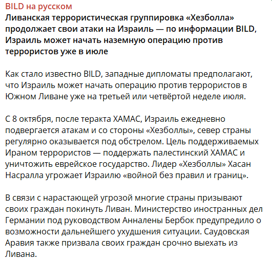 Израиль может начать наземную операцию против ливанской "Хезболлы" уже в июле - Bild