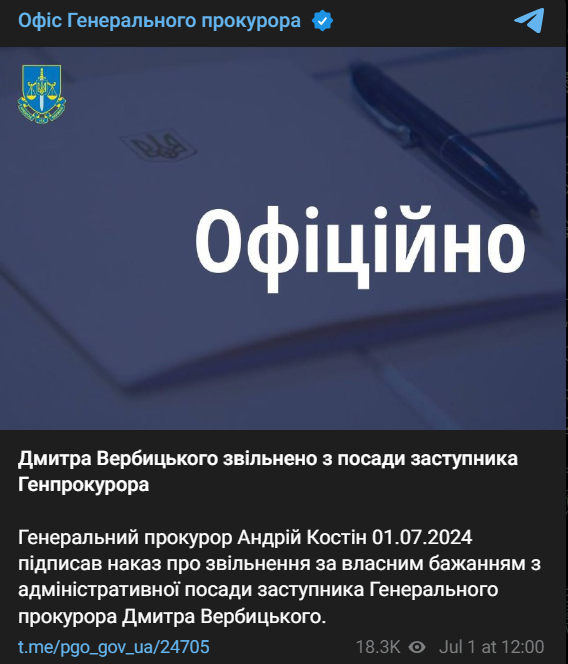 Генеральный прокурор Андрей Костин 1 июля подписал соответствующий приказ об увольнении Вербицкого по собственному желанию.