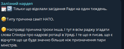 "Типа причина саммит НАТО. На самом деле причина немного другая. И тут я всем советую вспомнить слова спикера о кадровых ротациях в правительстве. И то, что я писал, что есть ощущение, что это будет значительно больше, чем назначение пары министров", - пишет депутат.