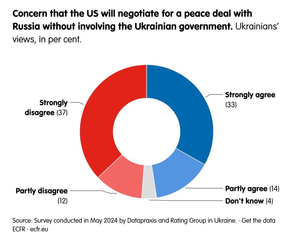 Также 47% украинцев прямо или частично поддерживают прямые переговоры США и России по Украине без участия Киева. 49% против такого варианта. То есть почти поровну.