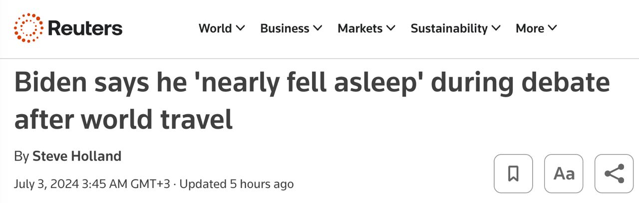 Reuters пишет, что Байден действительно летал в прошлом месяце во Францию ​​и Италию в течение двух недель, но шесть дней перед дебатами он готовился к ним в Кэмп-Дэвиде.