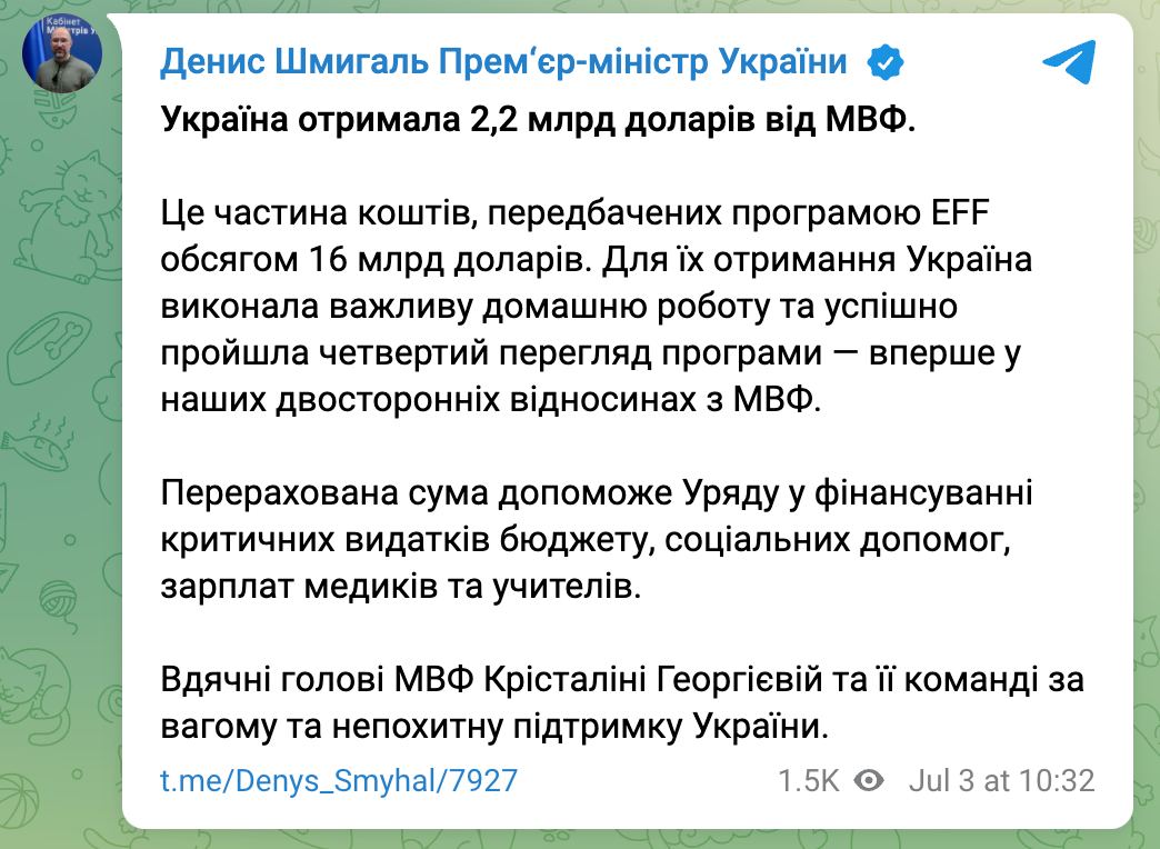 Премьер-министр Денис Шмыгаль заявил, что Украина получила 2,2 миллиарда долларов от МВФ. Это часть от общей суммы программы "Механизм расширенного финансирования" (EFF), которая составляет 16 миллиардов долларов.