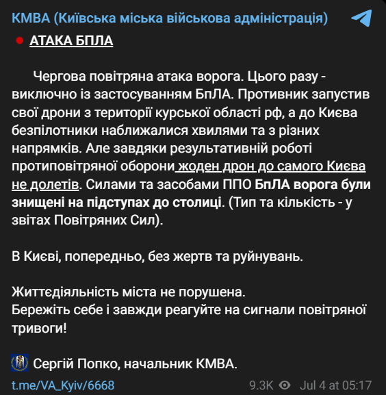 По данным военной администрации столицы, в сам Киев ни один беспилотник не попал, все были сбиты на подступах.