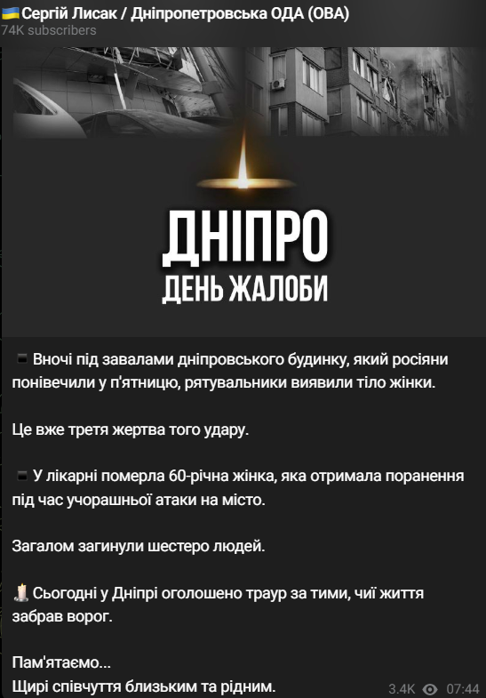 "Сегодня в Днепре объявлен траур по тем, чьи жизни унес враг", - написал Лысак.