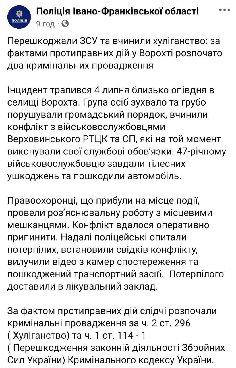 Полиция открыла два уголовных производства по конфликту жителей Ворохты и ТЦК: по препятствованию работе ВСУ и хулиганству.
