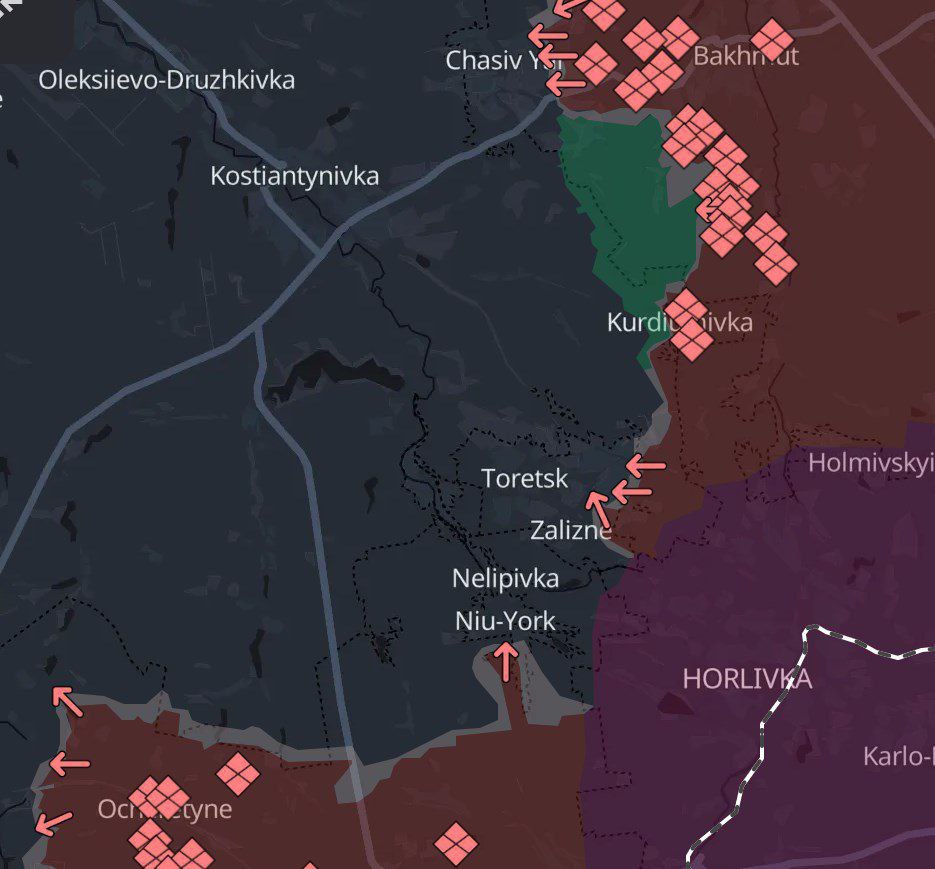 Что касается дальнейших действий на данном участке фронта, то, скорее всего, армия РФ попытается развить наступление на Нью-Йорк, полностью захватит этот поселок, после чего Торецк с пригородами окажется в фактическом полуокружности, так же как и части ВСУ, которые стоят на ещё старых линиях обороны около Горловки к западу от Нью-Йорка (их сейчас россияне, получается, обходят с запада и с севера).