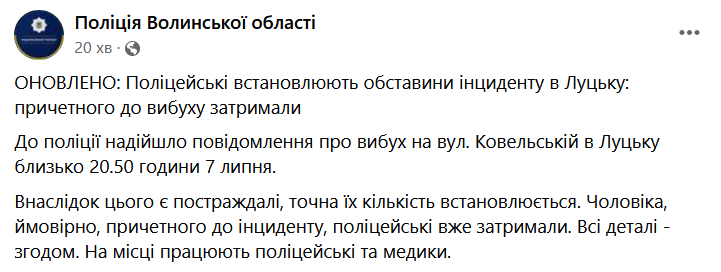 "В полицию поступило сообщение о взрыве по ул. Ковельской в Луцке около 20:50 7 июля. В результате есть пострадавшие, точное их количество устанавливается. Мужчину, вероятно, причастного к инциденту, полицейские уже задержали. На месте работают полицейские и медики", - говорится в сообщении полиции.