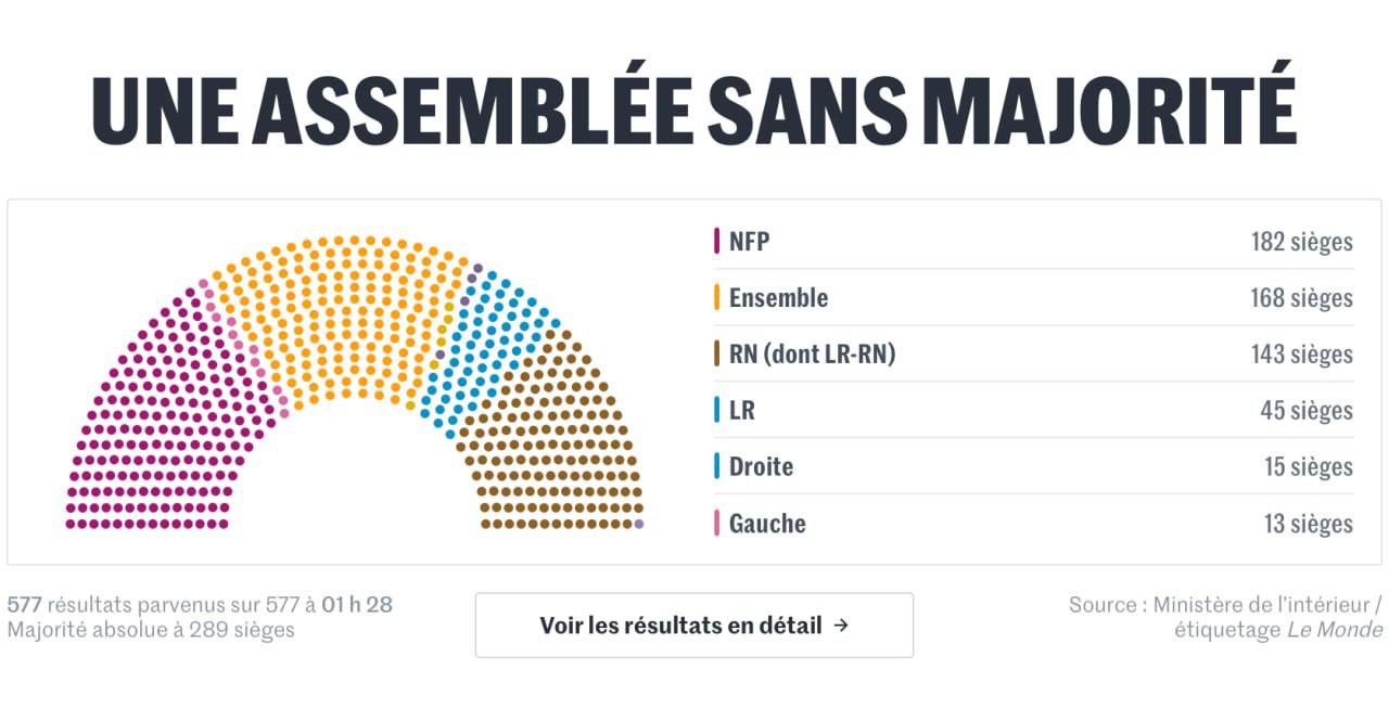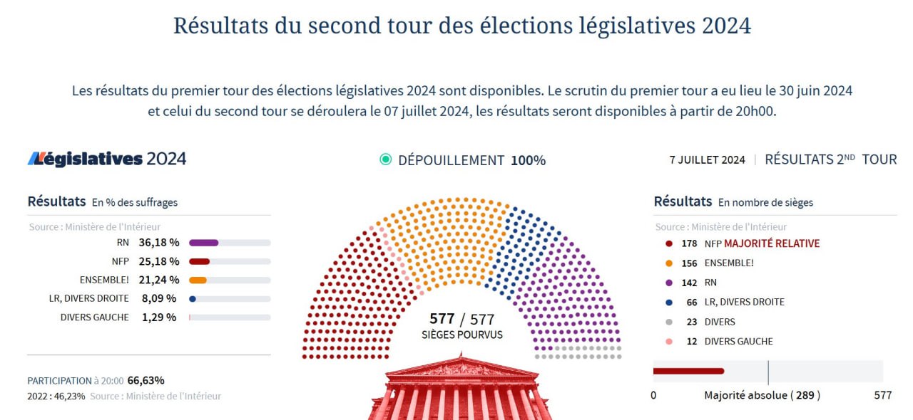 Второе  место занял центристский блок Эмманюэля Макрона "Вместе" (156 депутатов). На третьем - правое "Национальное объединение" Марин Ле Пен (142 мандата).