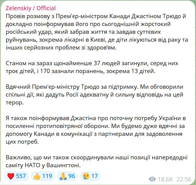 По последним данным, в результате сегодняшних ударов по Украине не менее 37 человек погибли, среди них трое детей. Еще 170 людей получили ранения, в том числе 13 детей.