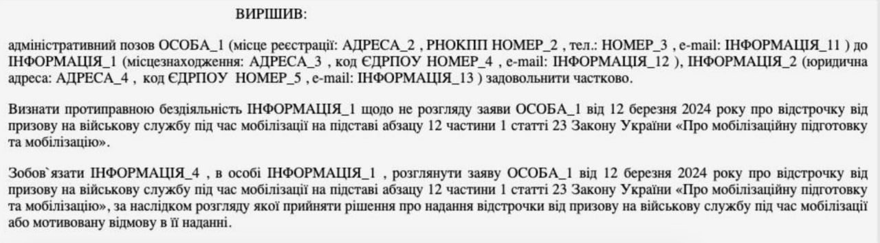 В итоге суд вынес вердикт, которым частично удовлетворил иск мужчины, и обязал ТЦК рассмотреть документы, подтверждающие право на отсрочку, полученные по почте. Также суд постановил взыскать с ТЦК 484 гривни судебных издержек в пользу военнообязанного.