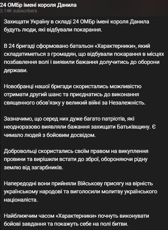 Тем временем 24 ОМБр сообщает о формировании в своем составе батальона "Характерники", в котором будут служить бывшие заключенные. Они уже приняли военную присягу и провозгласили молитву украинского националиста.