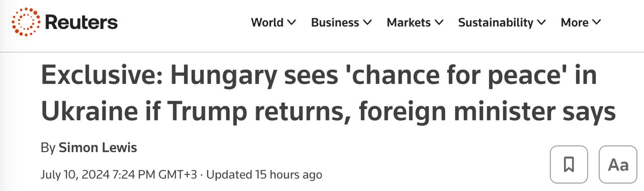 "Я думаю, что должно произойти очень сильное внешнее воздействие, чтобы заставить их (Россию и Украину - Ред.) хотя бы вести переговоры. У кого есть шанс на это в предстоящий период? Это только президент Трамп, если его изберут. Мы видим шанс на мир, если победит президент Трамп. Мы видим шанс на хорошие отношения между Венгрией и США, если победит президент Трамп", - сказал Сийярто.