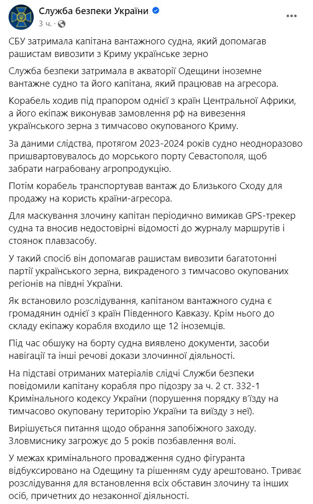 По данным следствия, сухогруз под флагом одной из стран Центральной Африки вывозил зерно из Крыма на Ближний Восток, для чего за последние полтора года неоднократно пришвартовывался в порт Севастополя.