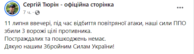 "11 июля вечером, во время отражения воздушной атаки, наши силы ПВО сбили 3 вражеских цели противника", - написал он.