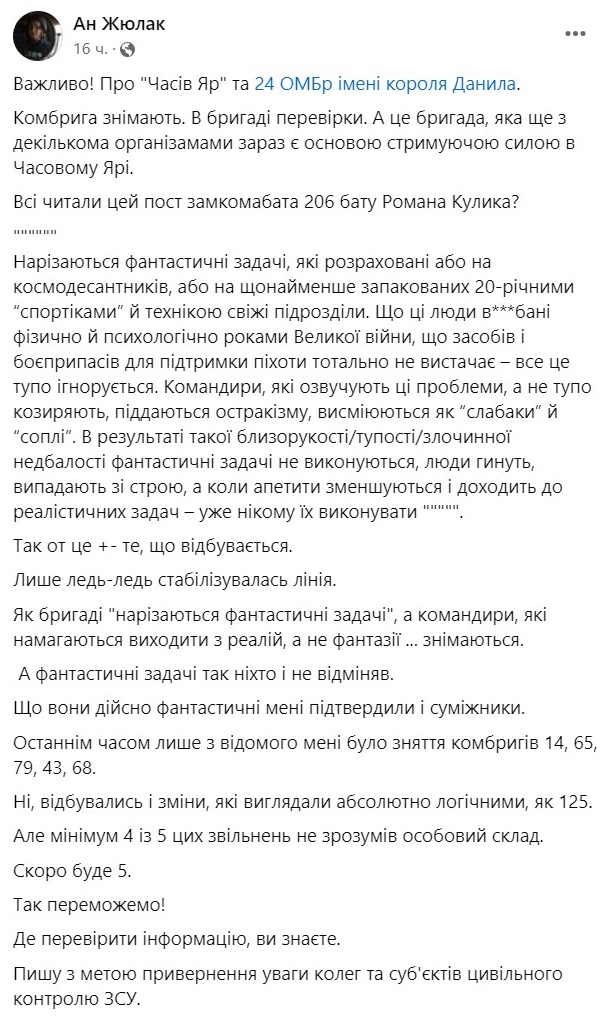 Она вспоминает пост командира из 206-го батальона ТРО Кулика, который заявил, что начальство ставит им нереальные задачи, игнорируя кадровый недобор в войсках, усталость военных и тотальную нехватку боеприпасов.