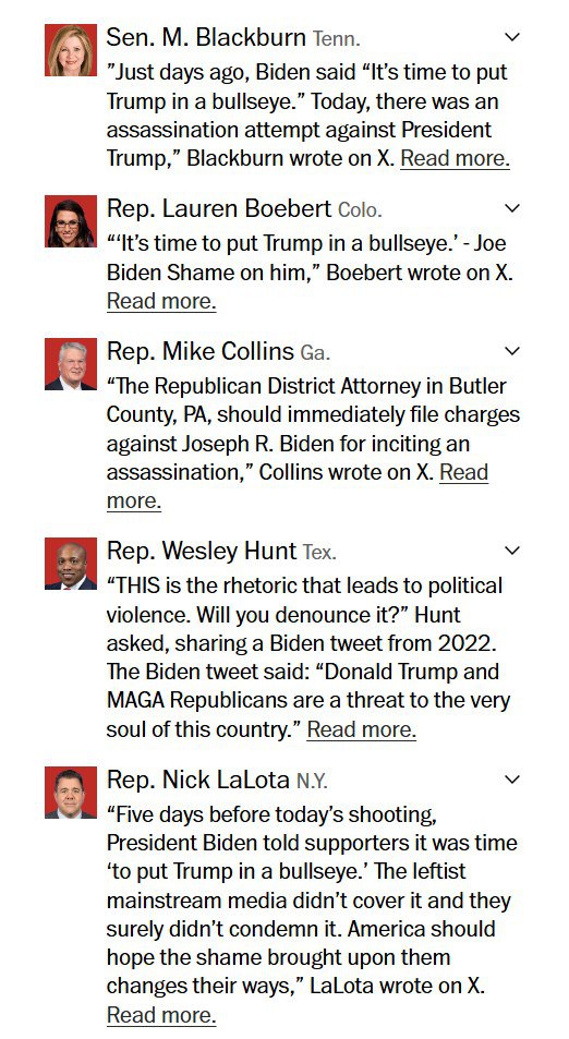 Эти слова Байдена также вспомнили член Палаты представителей Лорен Боберт, Ник Лалота и другие. Конгрессмен Майк Коллинз призвал прокурора округа Батлер, где произошло покушение, предъявить обвинения Джозефу Р. Байдену за подстрекательство к убийству.
