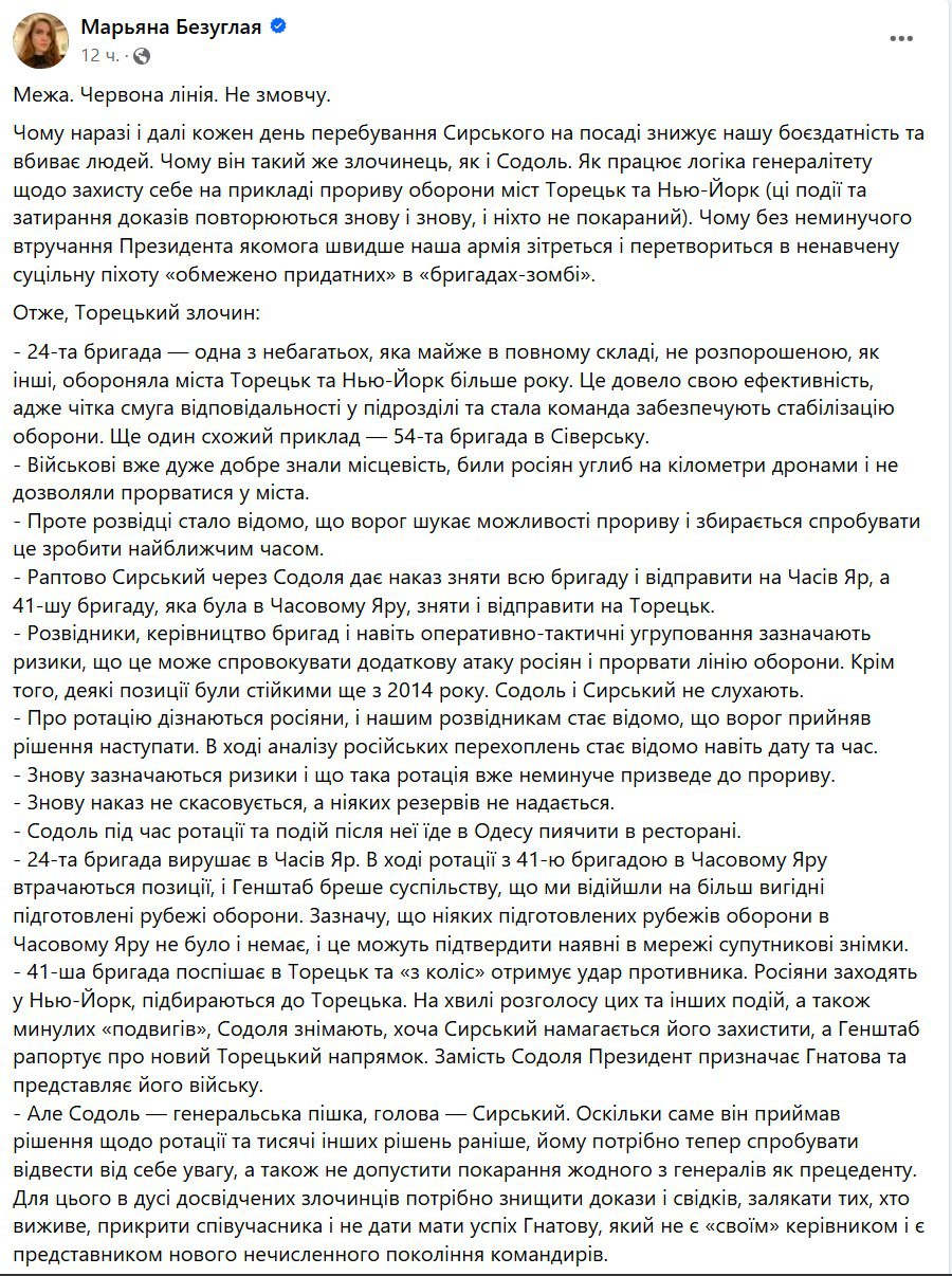 Об этом заявила в Facebook народный депутат Марьяна Безуглая, которая в последнее время критикует Сырского и украинский генералитет.