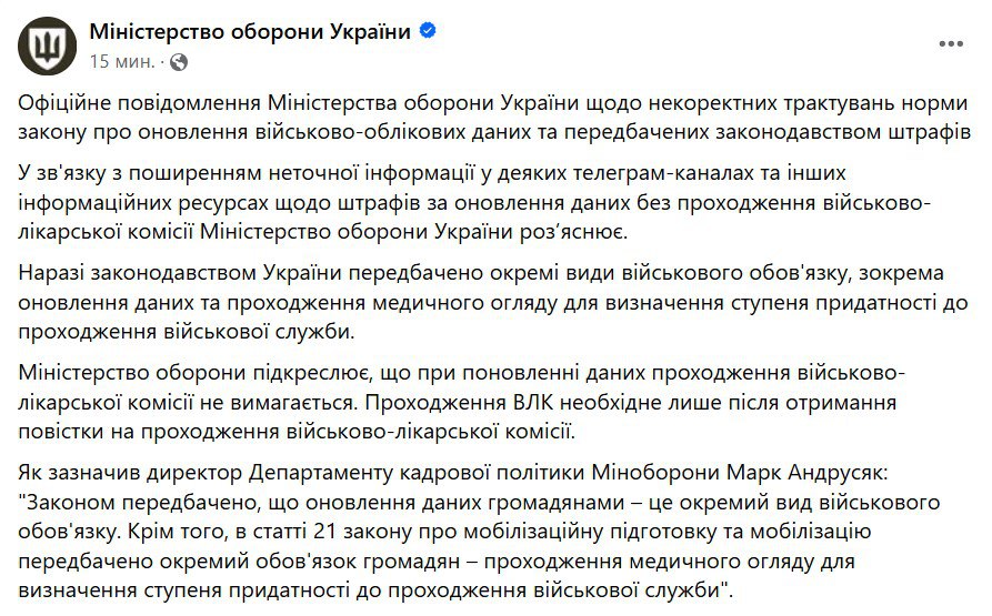Данные приводились со ссылкой на директора Департамента кадровой политики Минобороны Марка Андрусяка (на видео). Он заявил, что это два отдельных вида нарушения, которые облагаются штрафами, из чего многие паблики сделали вывод, что штрафы за отсутствие ВВК последуют "автоматически".