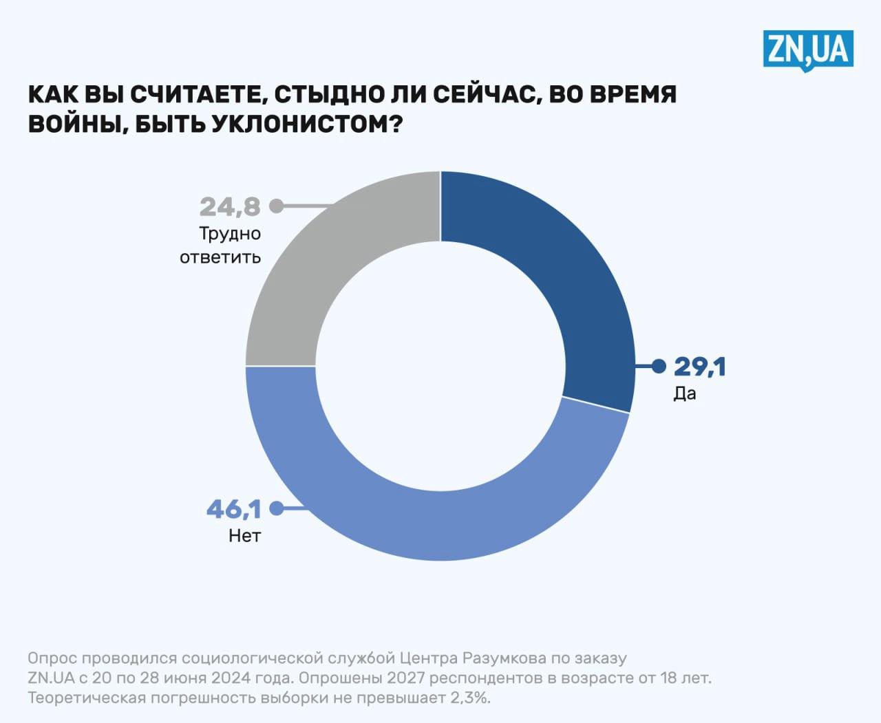 Почти половина опрошенных украинцев (46,1%) не считают постыдным быть уклонистом. Уклоняться от воинской службы считают зазорным 29,1%, затрудняются ответить 24,8%.