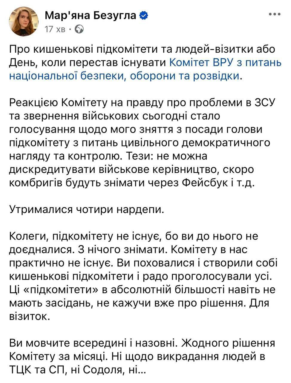 "Коллеги, подкомитета не существует, потому что вы к нему не присоединились. Не с чего снимать. Комитета у нас практически не существует. Вы спрятались и создали себе карманные подкомитеты и с радостью проголосовали все. У этих "подкомитетов" в абсолютном большинстве даже нет заседаний, не говоря уже о решении. Для визиток. Вы молчите внутри и снаружи. Никакого решения комитета за месяцы. Ни насчет похищения людей в ТЦК и СП, ни Содоля, ни…" - сказано в посте Безуглой.